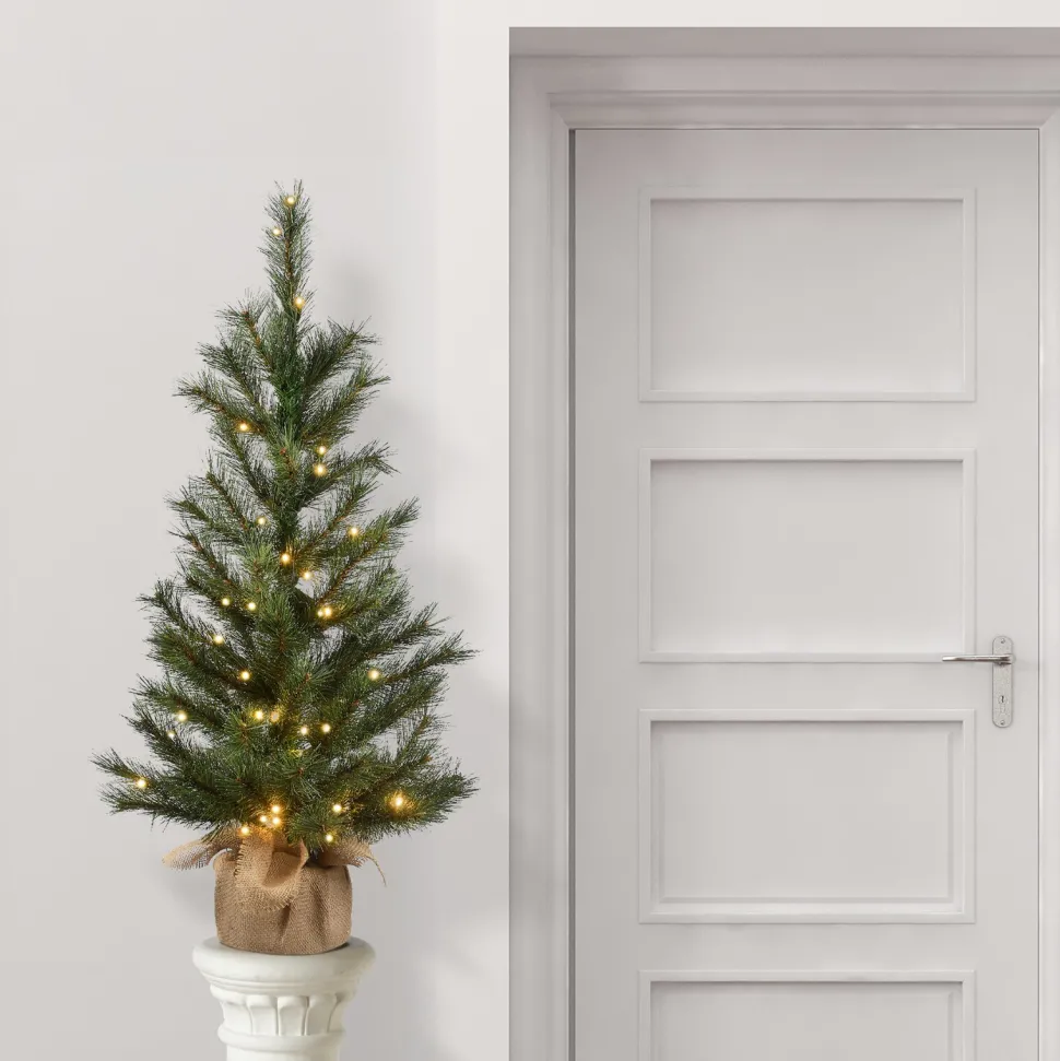 This Shorter Stature Tree Offers A More Traditional And Reserved Style For Holiday Decorating. It Features Wide Bristle Branches For A Softer Appearance, With Tips Designed To Resemble A Light Dusting Of Snow. Seated In A Burlap Bag Base, It Is Pre-Lit With 50 Battery-Operated Warm White Led Lights That Are Energy-Efficient And Long-Lasting. 6 Hours On/18 Hours Off-Timed Operation. Display This Tree In Indoor Or Covered Outdoor Locations.