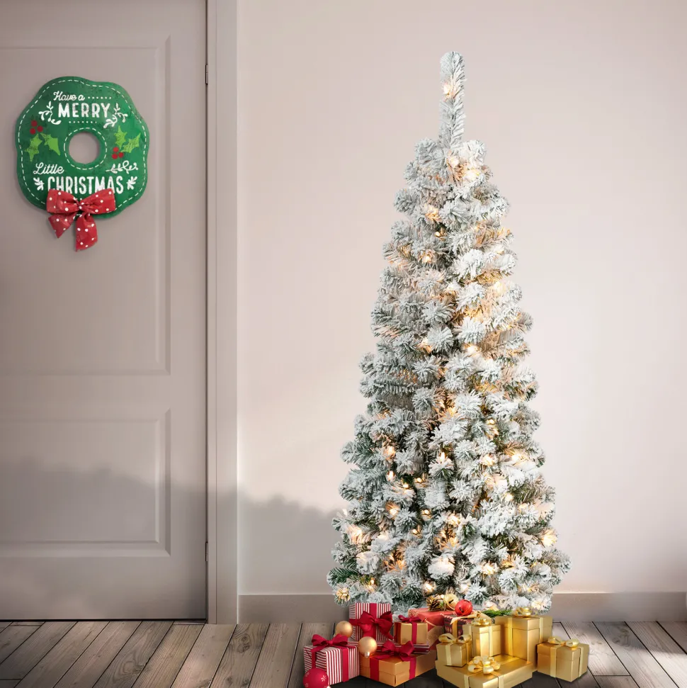 The Slim Tree Offers An Extra Thin Profile Making It A Great Choice For Display In Corners Or In Areas Where Floor Space Is Limited. This Tree Features Flocked Branches Giving The Appearance Of Freshly Fallen Snow. It Is Pre-Strung With 250 Clear Lights That Remain Lit Even If A Bulb Burns Out. This Two-Section Tree Features Hinged Branches For Ease Of Assembly. The Sturdy Folding Metal Tree Stand Is Included.